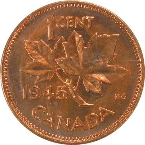 Canada Small Cent 1945 ICCS MS-64 Red. About 85% red with the typical orange-violet cast