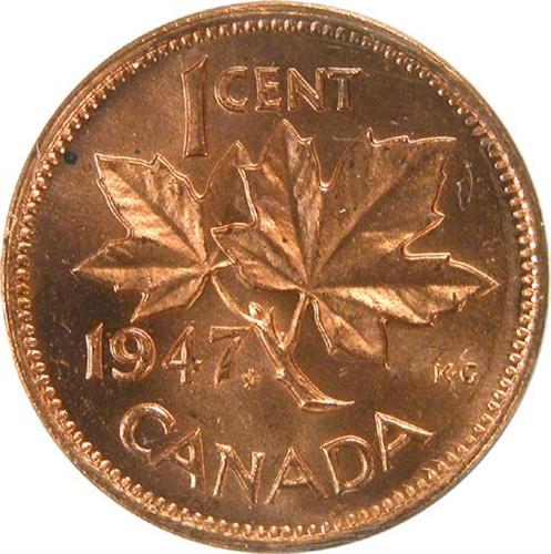 Canada Small Cent 1947 Maple Leaf Pointed 7 ICCS MS-64 Red. 90%
