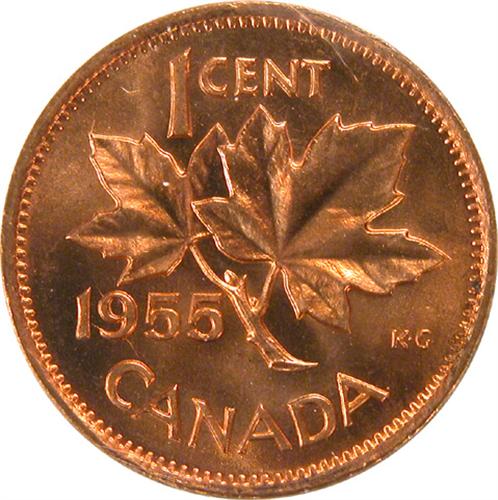 Canada Small Cent 1955 Shoulder Fold ICCS MS-65 Red. 90%