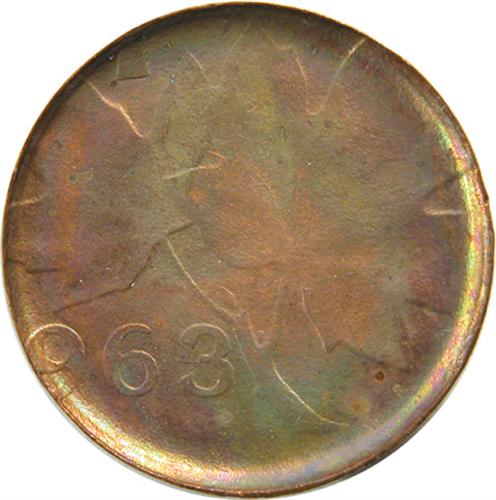 1 Cent 1963 Double Reverse Brockage, Choice Uncirculated with beautiful opalescent toning, likely caused by the high heat generated by the overfilled dies