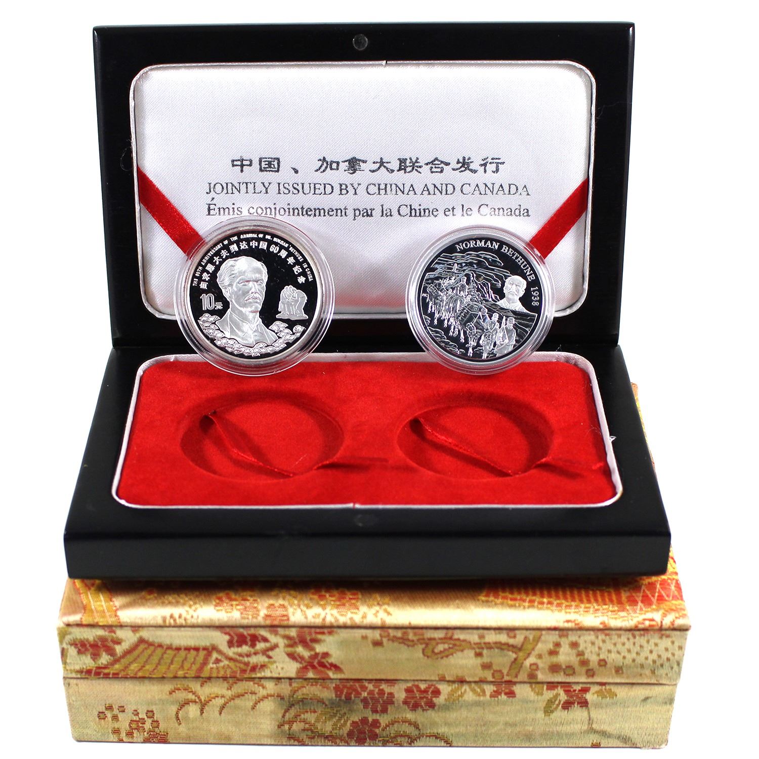 Canada/China 1998 Norman Bethune's Arrival to Canada-60th Anniversary 2-Piece Set of Fine Silver Coins. Conjunction issue between Royal Canadian Mint and China Gold Coin Incorporation (CGCI). Set Includes: China 10 Yuan; & $5. Minor wear to original packaging. (Tax Exempt)
