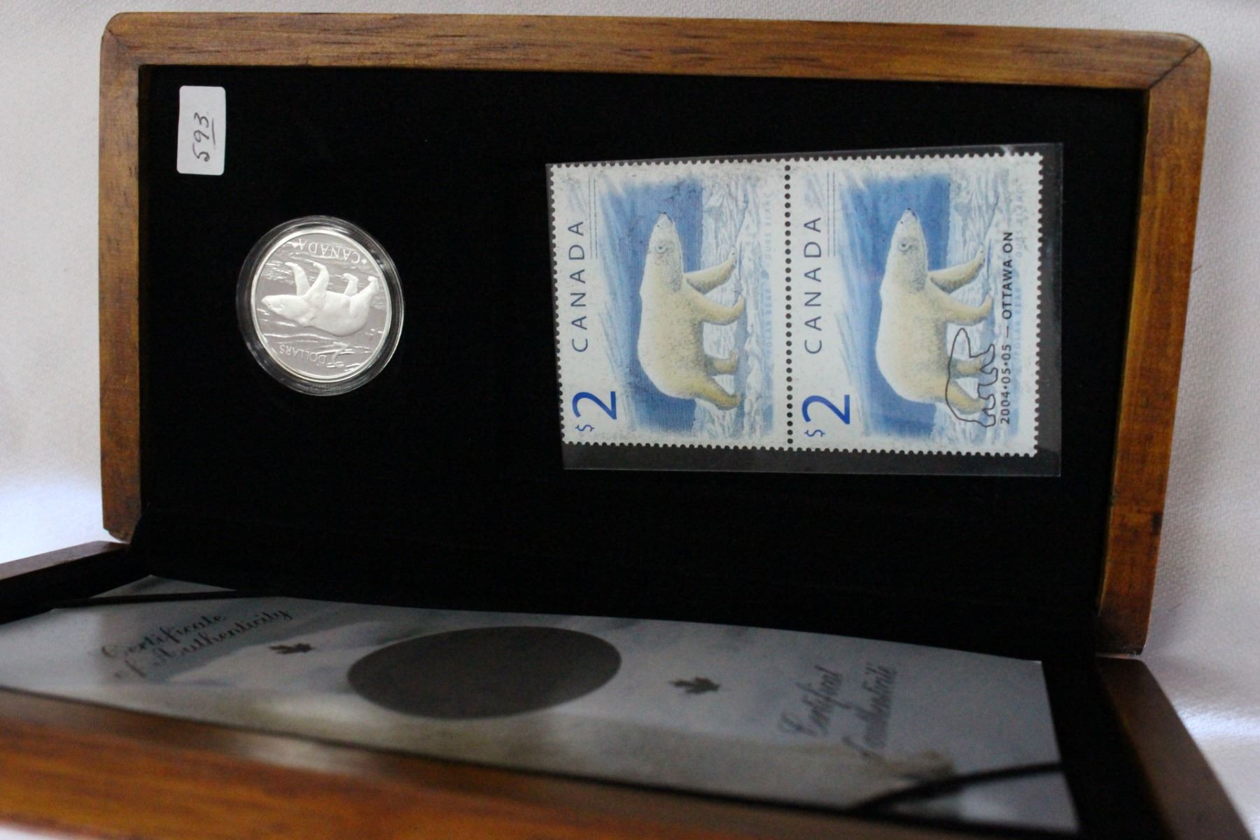 2004, Two Dollar Coin (.925% Silver); (2) 2 Dollar Stamps with COA; "The Proud Polar Bear", In a Wooden Box and Sleeve