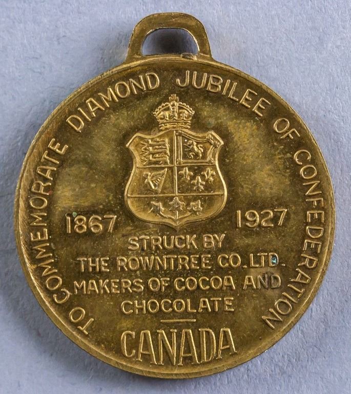 Canadian medallion. Obverse: Stamped with two portraits. Lettering: KING GEORGE V / QUEEN MARY. Reverse: Crest. Lettering: TO COMMEMORATE DIAMOND JUBILEE OF CONFEDERATION / 1867 1927 / STRUCK BY THE ROWNTREE CO. LTD. MAKERS OF COCOA AND CHOCOLATE / CANADA. Diameter: 3.5 cm, 21 grams.
