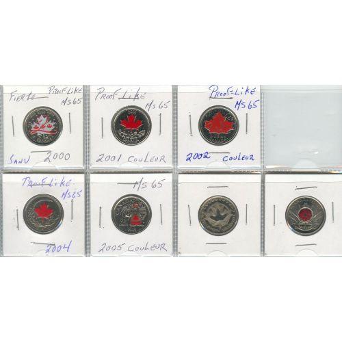 Canada Day 25 Cents Collection 5 different + 2 x 25 cents bonus; Colored one are January 2000 Pride, 2001, 2002, 2004 & 2005. Bonus are 2004 Red Poppy BU and 1999 Millenium Medallion circ. To be viewed, sold as is no return.