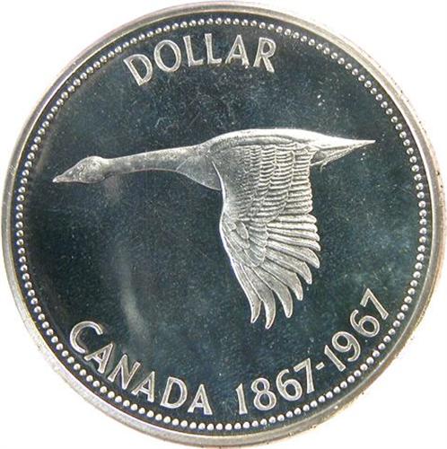 Canada Silver Dollar 1967 PCGS PR-66 DCam. This is a near untoned example with a 10o die rotation “Swooping Goose”