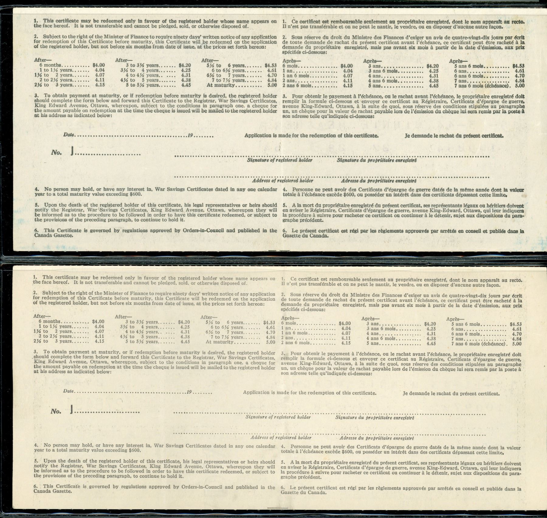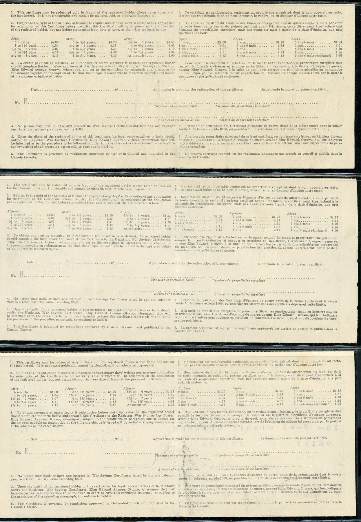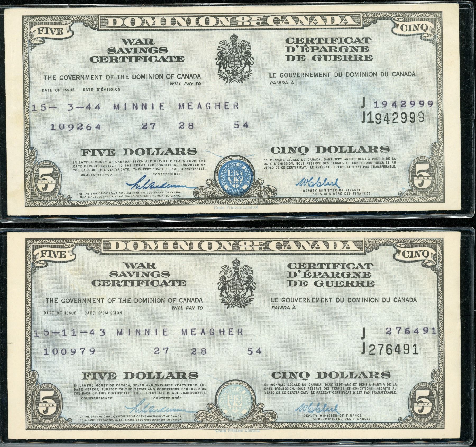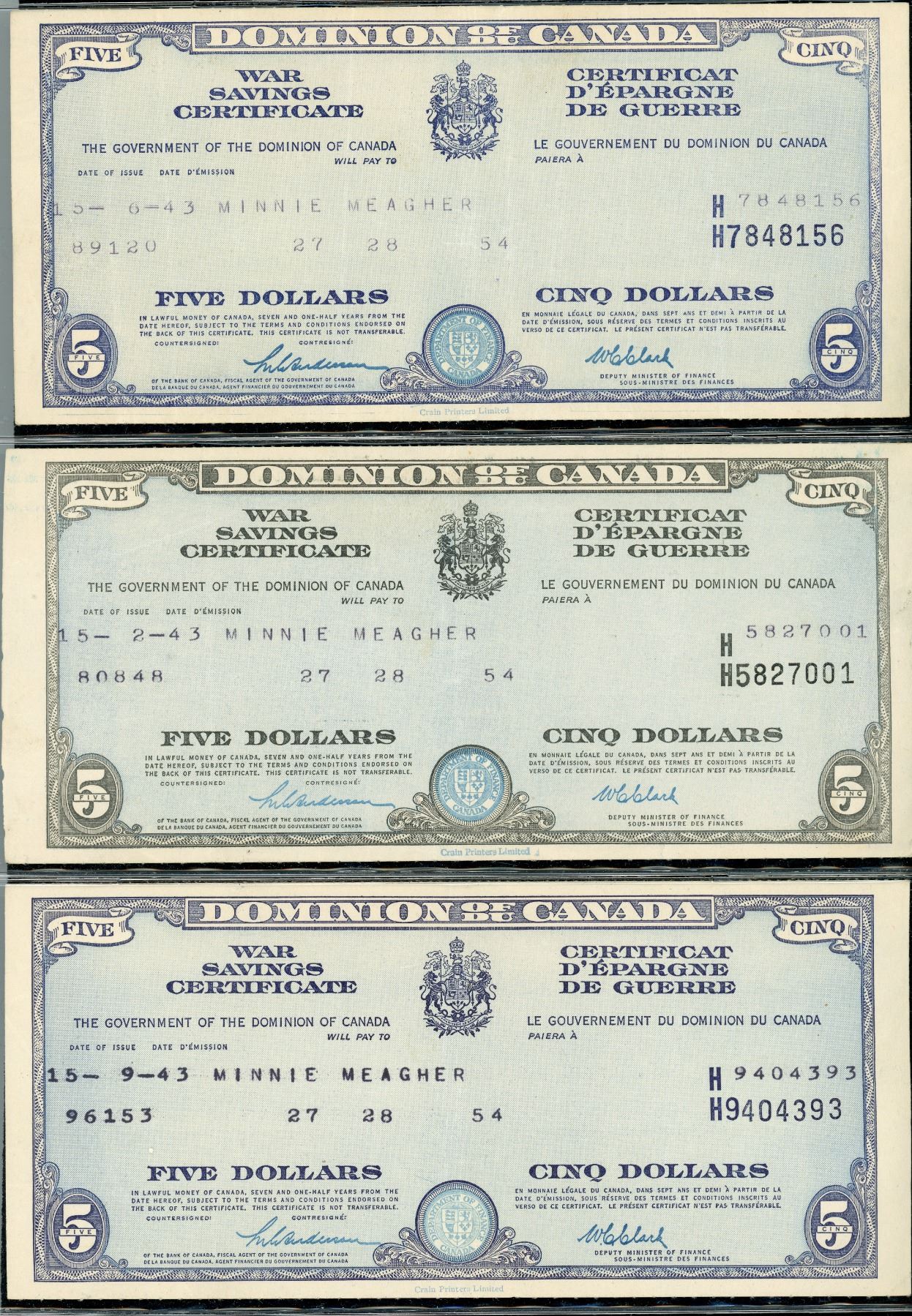 A group of five pieces, Dominion of Canada War Savings Certificates, Five Dollar Denominations. All sold to a Minnie Meagher, and dated 1943 with exception of a single 1944 issues. All nice VF (lot of 5 pieces)