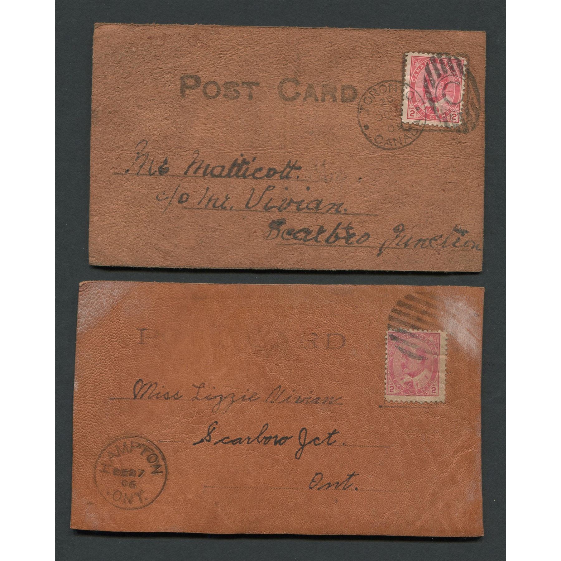 Canada Edward VII leather post cards. The stamps are both 2 cents. One has a clear and distinct Hampton, Ontario circle cancel, cancelled 1906, and the other has a clear and distinct Toronto, Ontario circle cancel, cancelled 1909.