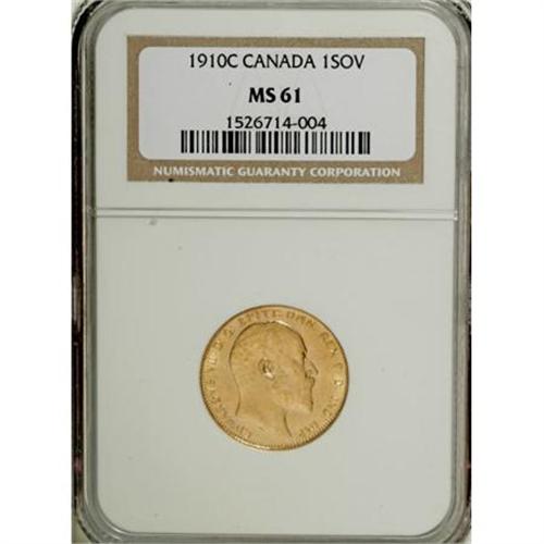 <B>Edward VII gold Sovereign 1910C,</B></I> KM14, MS61 NGC, a highly lustrous coin with typical small contact marks - quite nice for this designation.<BR><BR><b>Shipping:</b> Coins & Currency (<a target="_blank" href="http://www.heritageauctions.com/common/shipping.php">view shipping information</a>)