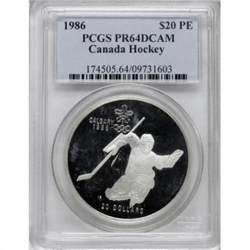 <B>Elizabeth II 20 Dollars 1986 Plain Edge,</B></I> KM148, Proof 64 Deep Cameo PCGS, Canada hockey.<BR><BR><b>Shipping:</b> Coins & Currency (<a target="_blank" href="http://www.heritageauctions.com/common/shipping.php">view shipping information</a>)