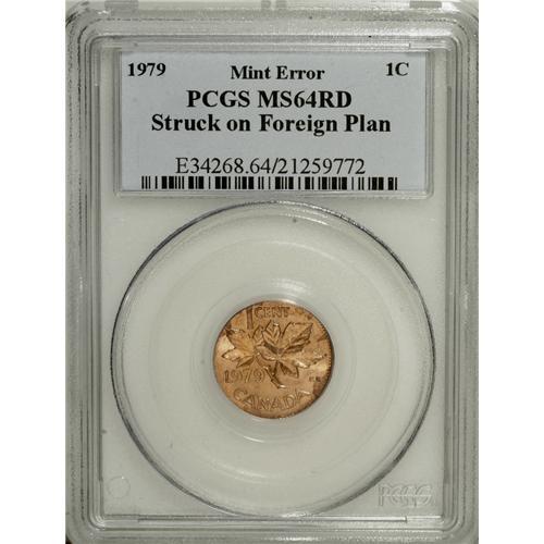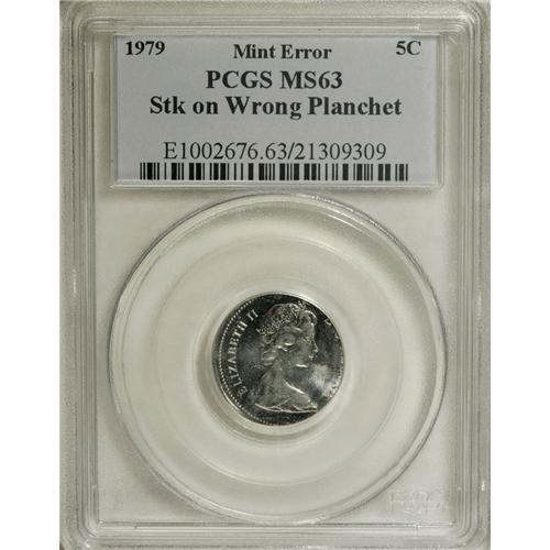 <B>Elizabeth II Certified Mint Errors, </B></I>Cent 1979 "Struck on a Foreign Plan" MS64 RED PCGS and 5 Cents 1979 "Struck on Wrong Planchet" MS63 PCGS. Both coins have clear denominations and dates.<BR><BR><b>Shipping:</b> Coins & Currency (<a target="_blank" href="http://www.heritageauctions.com/common/shipping.php">view shipping information</a>)