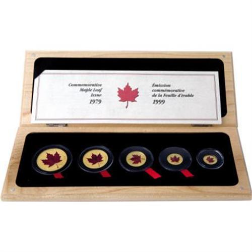 <B>Elizabeth II Gold Commemorative Maple Leaf Colored Five Piece Set, 1999, </B></I> including 1 Dollar, KM238, 5 Dollars, KM188, 10 Dollars, KM189, 20 Dollars, KM190 and 50 Dollars, KM191. Housed in the original wooden case with certificate. This set, with a small mintage of 500, was colored in Balerna, Switzerland and they are the first Canadian coins to be colored in this fashion.<BR><BR><b>Shipping:</b> Coins & Currency (<a target="_blank" href="http://www.heritageauctions.com/common/shipping.php">view shipping information</a>)