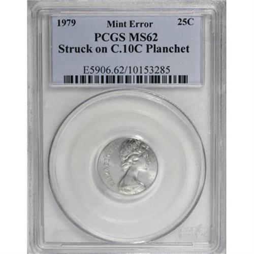 <B>Elizabeth II Mint Error 1979,</B></I> 25 Cents struck on a copper-nickel Dime planchet, MS62 PCGS, nice bold date.<BR><BR><b>Shipping:</b> Coins & Currency (<a target="_blank" href="http://www.heritageauctions.com/common/shipping.php">view shipping information</a>)
