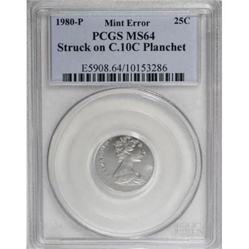 <B>Elizabeth II Mint Error 1980-P,</B></I> 25 Cents struck on a copper-nickel Dime planchet, MS64 PCGS, clear date.<BR><BR><b>Shipping:</b> Coins & Currency (<a target="_blank" href="http://www.heritageauctions.com/common/shipping.php">view shipping information</a>)