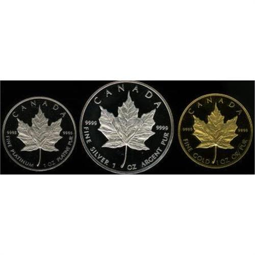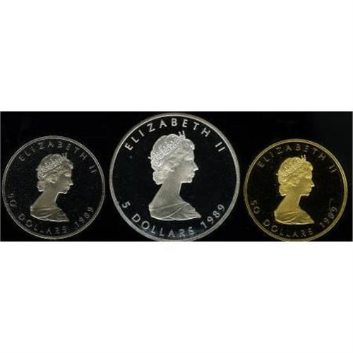 <B>Elizabeth II Three Piece 1989 Proof Set,</B></I> KM-PS12, comprising the 5 Dollars silver Ounce Maple Leaf KM163, gold 50 Dollars (Ounce) KM125.2 and platinum 50 Dollars (Ounce) KM167, all housed in the original plush case of issue with the certificate of authenticity. All three coins are superb cameo Proofs.<BR><BR><b>Shipping:</b> Coins & Currency (<a target="_blank" href="http://www.heritageauctions.com/common/shipping.php">view shipping information</a>)