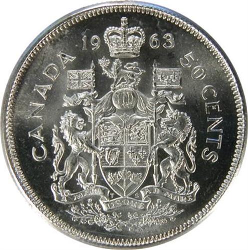 Canada Fifty Cents 1963 ICCS MS-65. Pale golden toning. It is tied highest graded by ICCS