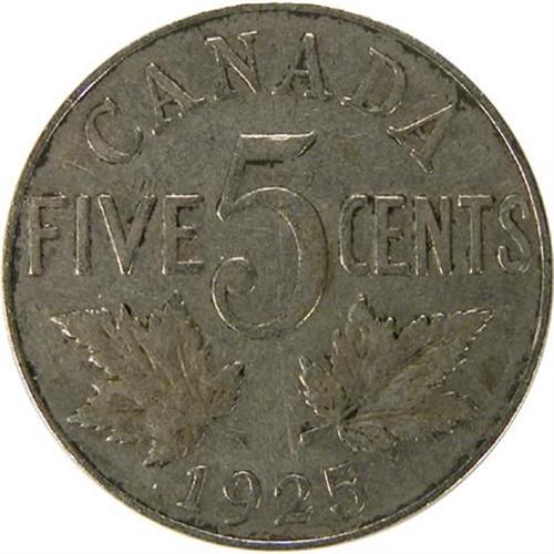 Canada Five Cents 1925 Fine. Scratch and rim bumps