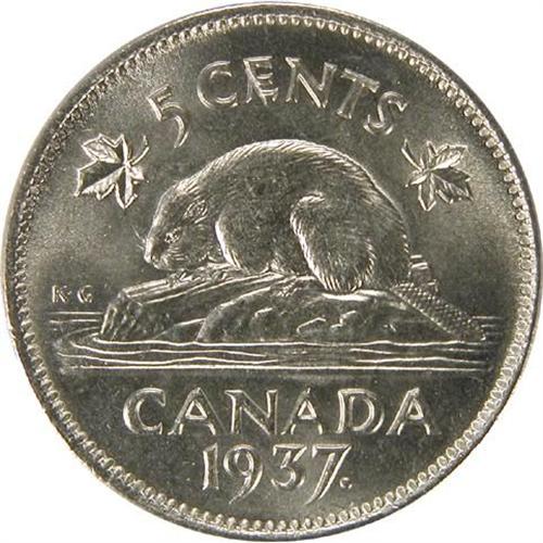 Canada Five Cents 1937 ICCS MS-65. This is a near fully struck piece with just a hint of the typical weakness on the eyebrow. It is tied as the highest graded by ICCS