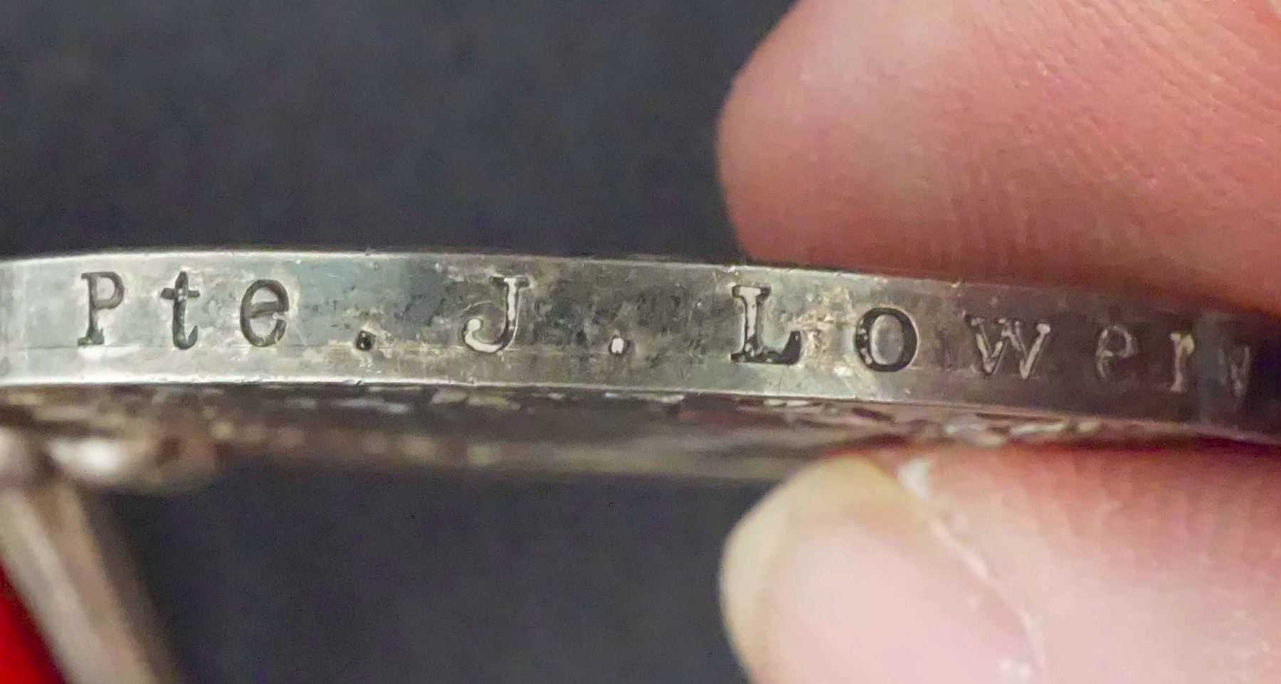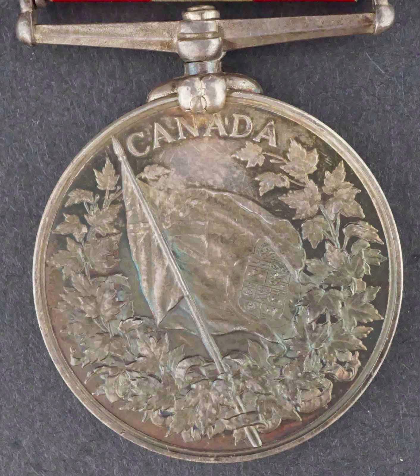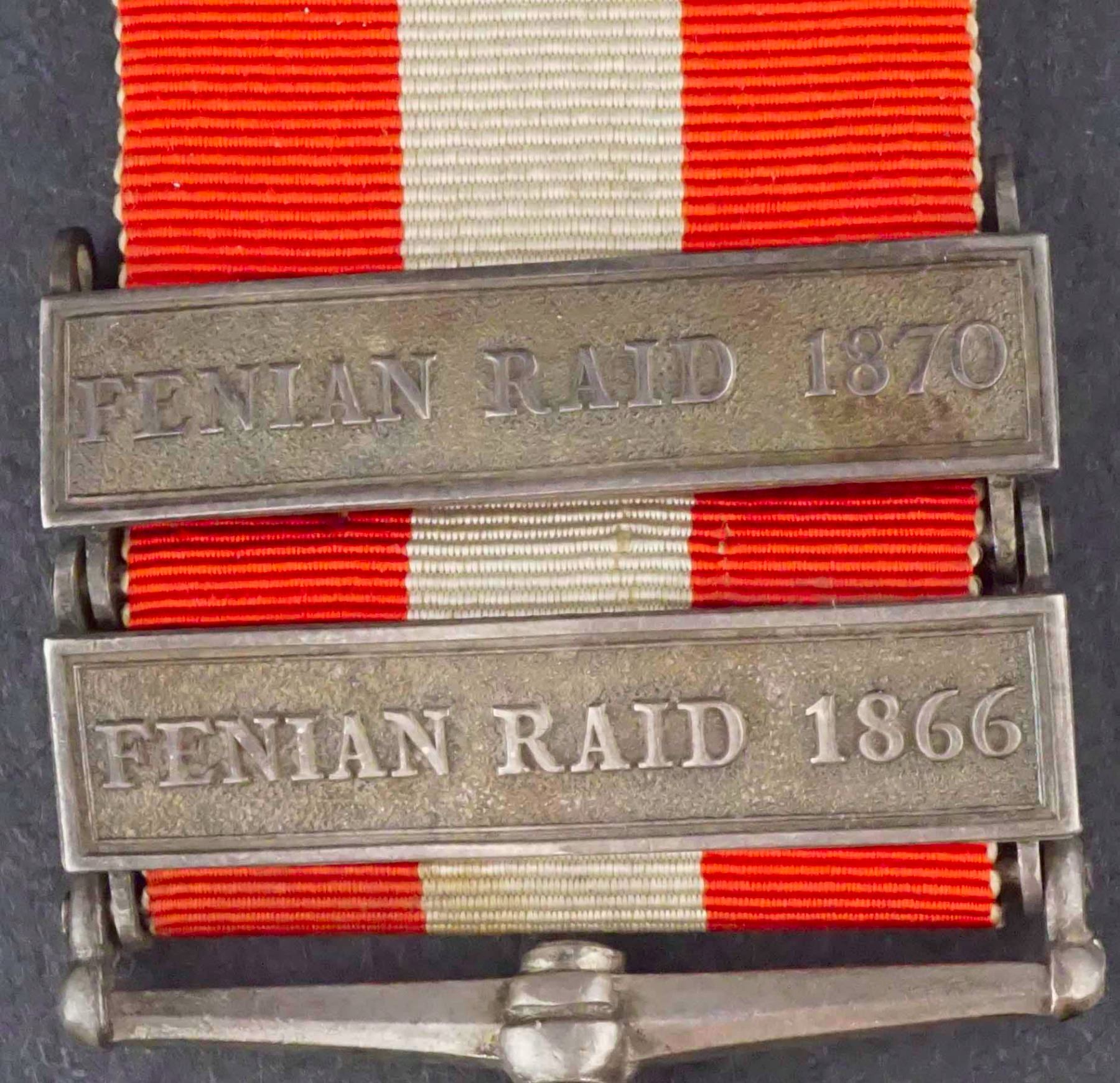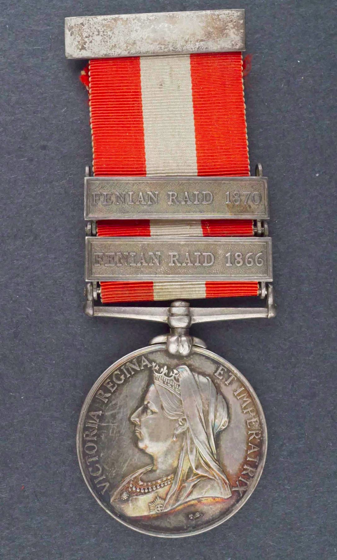 Canada General Service Medal with Original Ribbon and Two Bars : FENIAN RAID 1866 and FENIAN RAID 1870. A beautiful example in choice AU condition, with glossy surfaces. Rarely seen so nice. Edge engraved : Pte. J. Lowery 1st P. W. R.