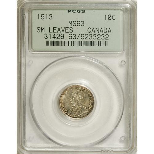 <B>George V 10 Cents 1913 Small Leaves, </B></I>KM23, MS63 PCGS, lovely deep gold and blue patina over fully lustrous surfaces.<BR><BR><b>Shipping:</b> Coins & Currency (<a target="_blank" href="http://www.heritageauctions.com/common/shipping.php">view shipping information</a>)