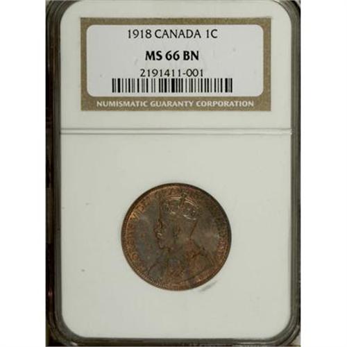 <B>George V Cent 1918,</B></I> KM21, MS66 BN NGC, despite being designated as "Brown," this coin displays considerable original mint luster.<BR><BR><b>Shipping:</b> Coins & Currency (<a target="_blank" href="http://www.heritageauctions.com/common/shipping.php">view shipping information</a>)