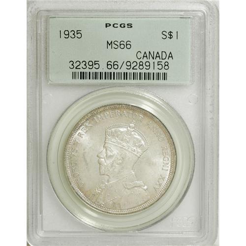 <B>George V Dollar 1935, </B></I>KM30, MS66 PCGS, a splendid coin with that perfect blend of silvery mint brilliance and subtle gray toning, very scarce this nice.<BR><BR><b>Shipping:</b> Coins & Currency (<a target="_blank" href="http://www.heritageauctions.com/common/shipping.php">view shipping information</a>)