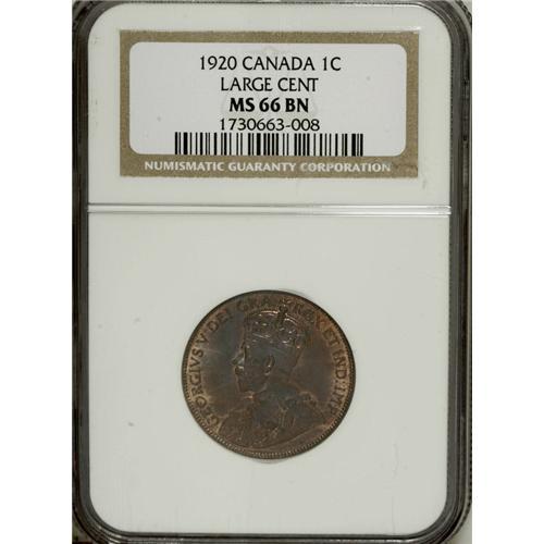 <B>George V Large Cent 1920, </B></I>KM21, MS66 Brown NGC, a gorgeous example with virtually perfect surfaces and abundant mint brilliance, very scarce in this designation.<BR><BR><b>Shipping:</b> Coins & Currency (<a target="_blank" href="http://www.heritageauctions.com/common/shipping.php">view shipping information</a>)