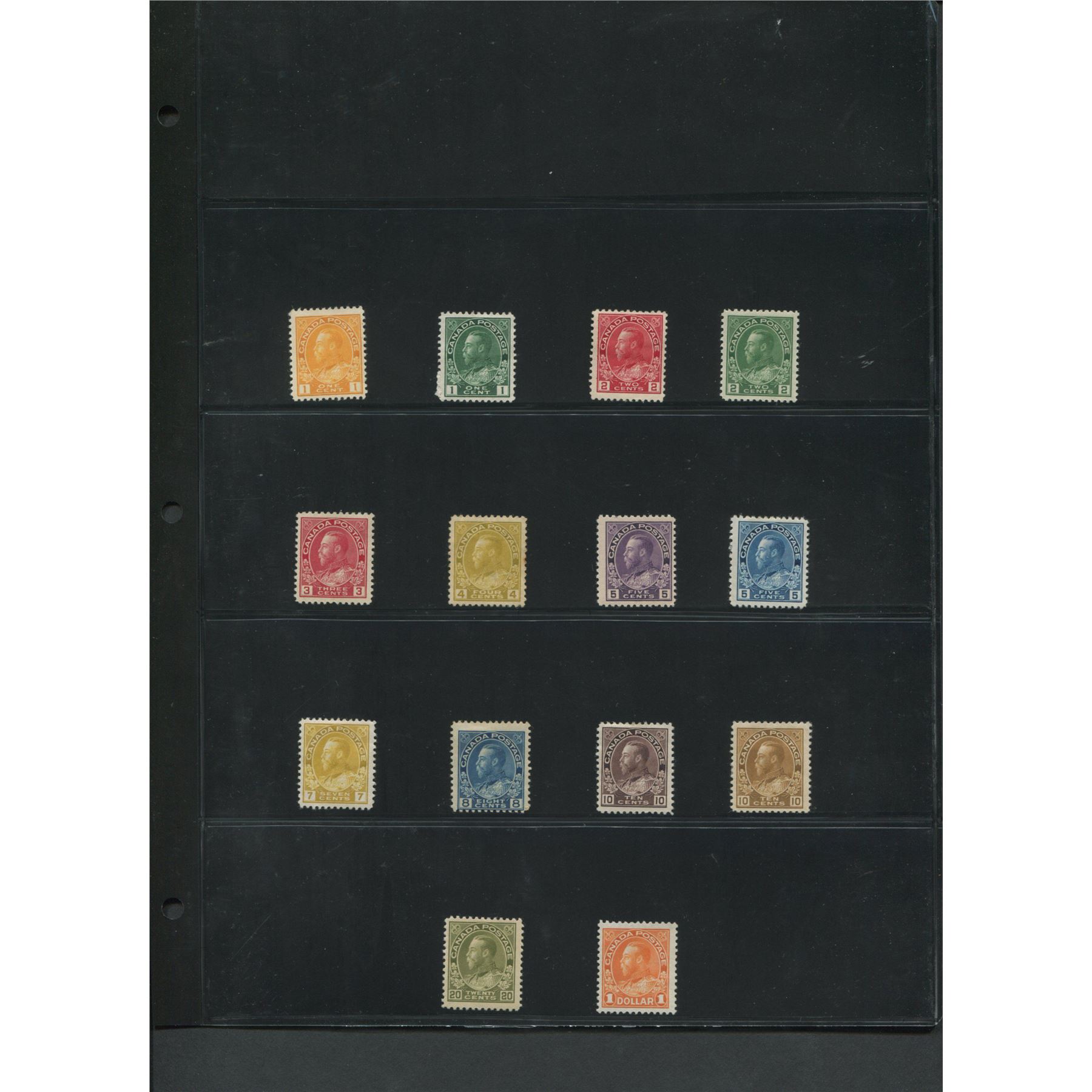 Canada George V MLH (mint lightly hinged) stamp collection. This collection contains 14 stamps, all of which are F/VF (fine/very fine). Please see photos.