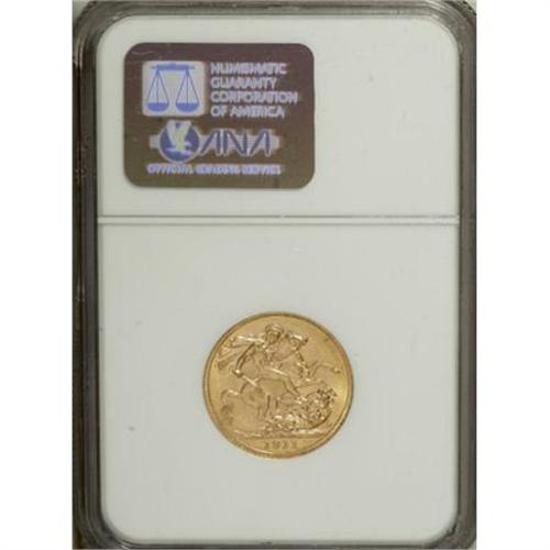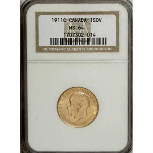 <B>George V gold Sovereign 1911C,</B></I> KM20, MS64 NGC, nice surfaces and well above average for this date.<BR><BR><b>Shipping:</b> Coins & Currency (<a target="_blank" href="http://www.heritageauctions.com/common/shipping.php">view shipping information</a>)