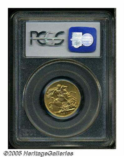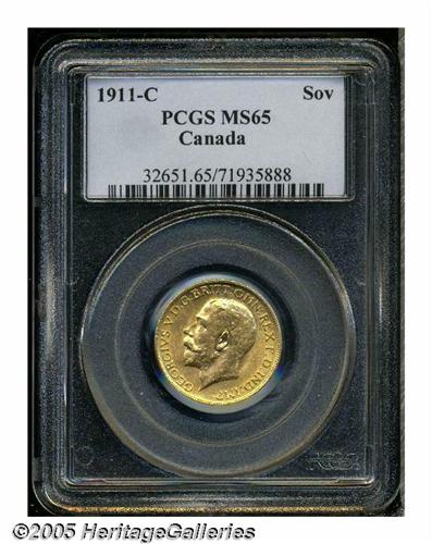 <B>George V gold Sovereign 1911C, </B></I>KM20, MS65 PCGS, highly lustrous and very scarce this nice.