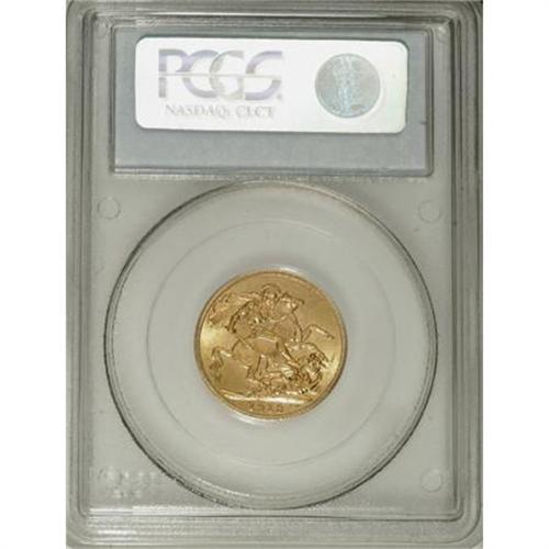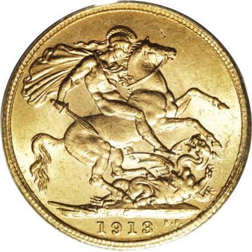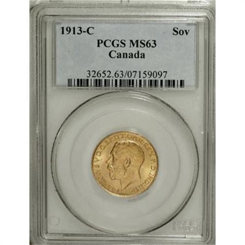 <B>George V gold Sovereign 1913C,</B></I> KM20, MS63 PCGS, fully brilliant, a very handsome example, and rare in this grade.<BR><BR><b>Shipping:</b> Coins & Currency (<a target="_blank" href="http://www.heritageauctions.com/common/shipping.php">view shipping information</a>)
