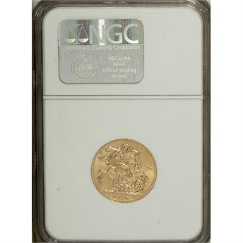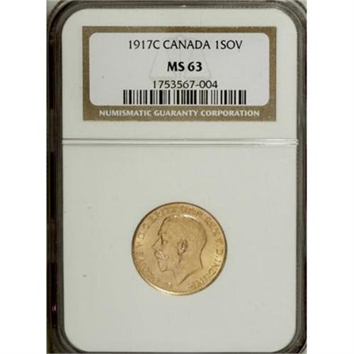 <B>George V gold Sovereign 1917C,</B></I> KM20, MS63 NGC.<BR><BR><b>Shipping:</b> Coins & Currency (<a target="_blank" href="http://www.heritageauctions.com/common/shipping.php">view shipping information</a>)