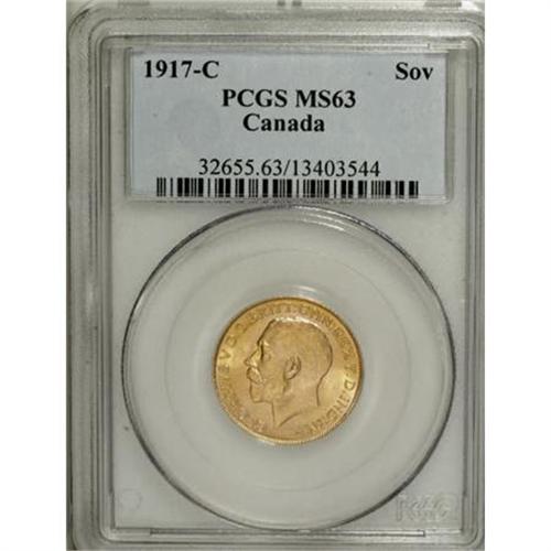 <B>George V gold Sovereign 1917C,</B></I> KM20, MS63 PCGS, few noticeable contact marks on the bust.<BR><BR><b>Shipping:</b> Coins & Currency (<a target="_blank" href="http://www.heritageauctions.com/common/shipping.php">view shipping information</a>)