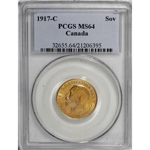 <B>George V gold Sovereign 1917C,</B></I> KM20, MS64 PCGS, very bright and attractive, scarce in this grade.<BR><BR><b>Shipping:</b> Coins & Currency (<a target="_blank" href="http://www.heritageauctions.com/common/shipping.php">view shipping information</a>)
