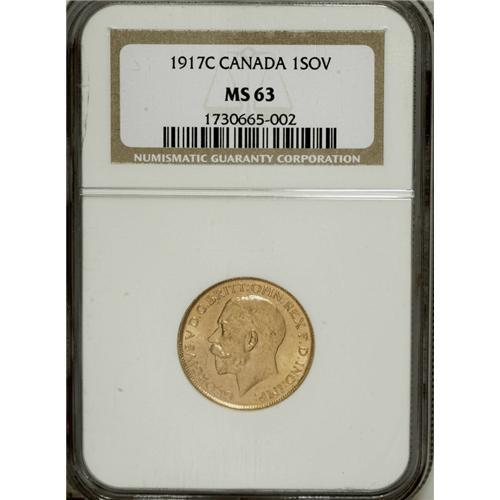 <B>George V gold Sovereign 1917C, </B></I>KM20, MS63 NGC, lightly toned.<BR><BR><b>Shipping:</b> Coins & Currency (<a target="_blank" href="http://www.heritageauctions.com/common/shipping.php">view shipping information</a>)