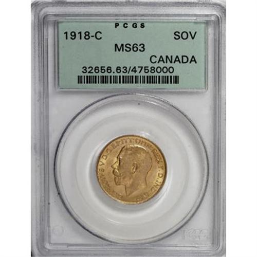 <B>George V gold Sovereign 1918C,</B></I> KM20, MS63 PCGS, a nice original coin.<BR><BR><b>Shipping:</b> Coins & Currency (<a target="_blank" href="http://www.heritageauctions.com/common/shipping.php">view shipping information</a>)
