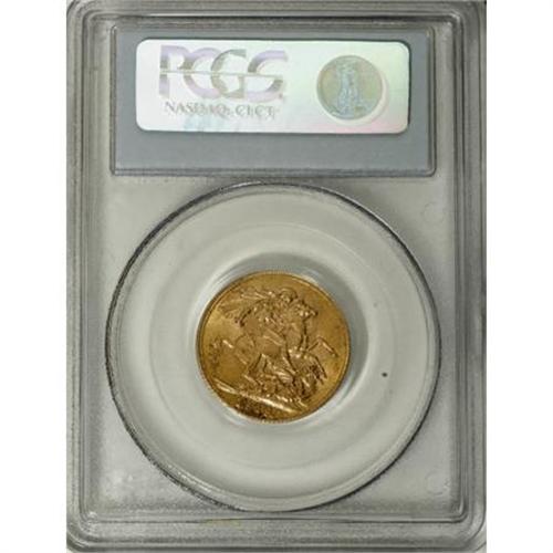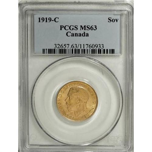 <B>George V gold Sovereign 1919C,</B></I> KM20, MS63 PCGS, lightly toned with exceptionally blemish-free surfaces.<BR><BR><b>Shipping:</b> Coins & Currency (<a target="_blank" href="http://www.heritageauctions.com/common/shipping.php">view shipping information</a>)