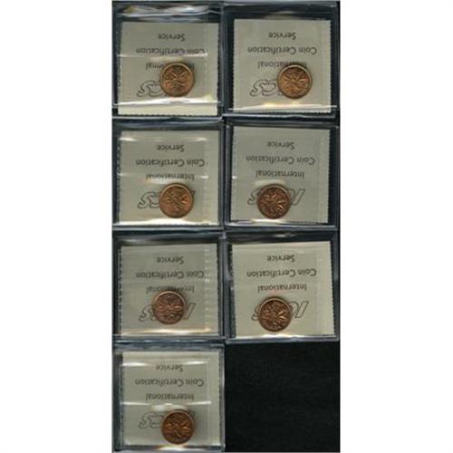 <B>George VI Cent Date Collection,</B></I> all ICCS certified: 1939 MS65 Red, 1940 MS65 Red, 1941 MS64 Red, 1946 MS64 Red, 1947 MS64 Red and MS65 Red and 1949 A off Denticle, MS64 Red. <B>Sold as is, no return lot.</B></I><BR><BR><b>Shipping:</b> Coins & Currency (<a target="_blank" href="http://www.heritageauctions.com/common/shipping.php">view shipping information</a>)