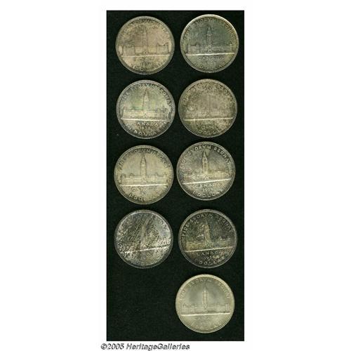 <B>George VI Dollar 1939 - Nine Examples!, </B></I>KM38, Royal Visit commemorative, AU, and eight UNC's, all nice original toned coins, three which are clearly superior grades. Careful viewing is recommended! <B>Sold as is, no return lot.</B></I>