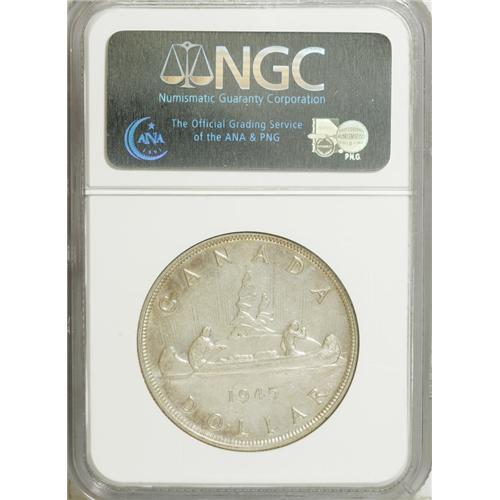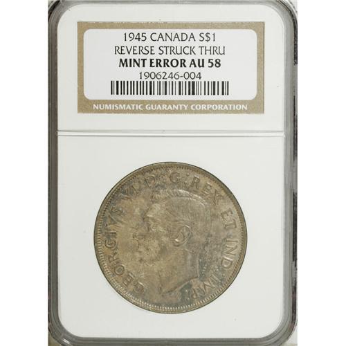 <B>George VI Dollar 1945 Mint Error, </B></I>KM37, AU58 NGC, a nicely toned example struck with an impression of a thread on the reverse flan running from the first L of Dollar through the date.<BR><BR><b>Shipping:</b> Coins & Currency (<a target="_blank" href="http://www.heritageauctions.com/common/shipping.php">view shipping information</a>)