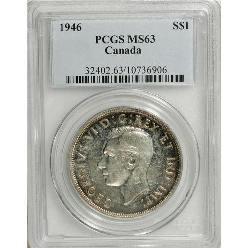 <B>George VI Dollar 1946, </B></I>KM37, MS63 PCGS, light peripheral toning.<BR><BR><b>Shipping:</b> Coins & Currency (<a target="_blank" href="http://www.heritageauctions.com/common/shipping.php">view shipping information</a>)