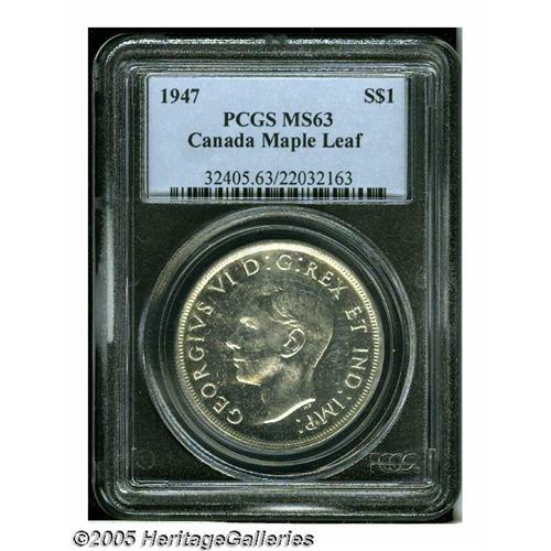 <B>George VI Dollar 1947 Maple Leaf, </B></I>KM37, MS63 PCGS.