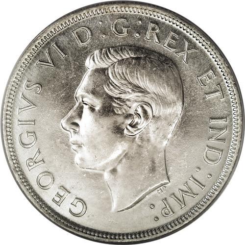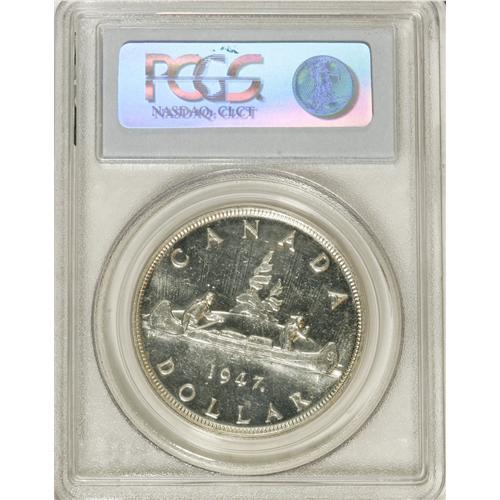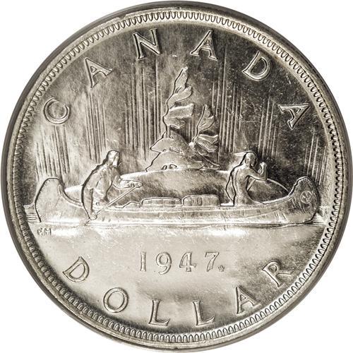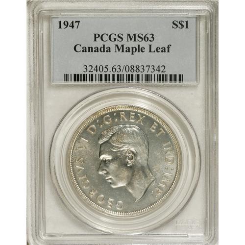 <B>George VI Dollar 1947 Maple Leaf 2X HP, </B></I>KM37, MS63 PCGS, a choice example with full mint brilliance.<BR><BR><b>Shipping:</b> Coins & Currency (<a target="_blank" href="http://www.heritageauctions.com/common/shipping.php">view shipping information</a>)