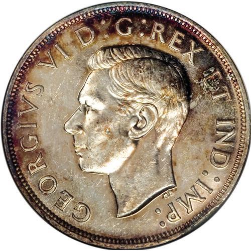 <B>George VI Dollar 1947 Pointed 7 4X HP, </B></I>KM37, MS62 ANACS, a pretty example with harvest orange and russet patina, very scarce this nice.<BR><BR><b>Shipping:</b> Coins & Currency (<a target="_blank" href="http://www.heritageauctions.com/common/shipping.php">view shipping information</a>)