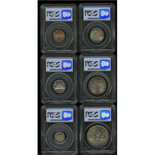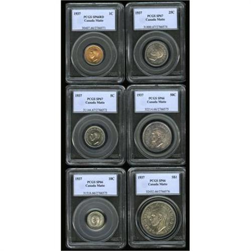 <B>George VI Matte Specimen Set 1937,</B></I> KM-SS33, an exceptional set with individual PCGS Specimen grades as follows: Cent 66 RED, 5 Cents 67, 10 Cents 66, 25 Cents 67, 50 Cents 66 and Dollar 66. All of the silver types are lightly toned and very attractive. Included with the coins is the original red cardboard presentation box from the Royal Canadian Mint.<BR><BR><b>Shipping:</b> Coins & Currency (<a target="_blank" href="http://www.heritageauctions.com/common/shipping.php">view shipping information</a>)
