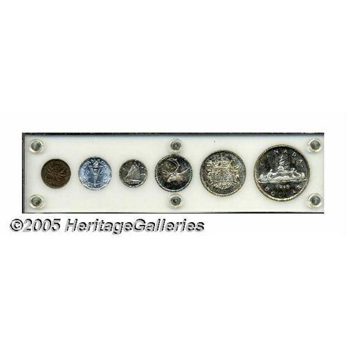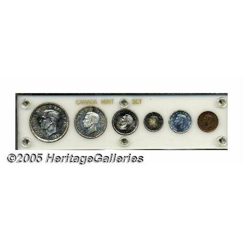 <B>George VI Mint Set 1945, </B></I>six coin set, Cent through Dollar, presented in a custom plastic holder. The Cent is toned, as are the 10 and 25 Cents, the Dollar is lightly hairlined on the obverse, but is mint state.