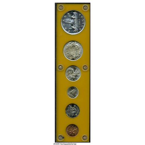 <B>George VI Mint Set 1947 Maple Leaf, </B></I>six coin set, Cent through Dollar, all are brilliant UNC, the 25 Cents is exceptional while the Dollar shows typical contact marks on the obverse. The Half is the curved left variety. Housed in a custom plastic holder.