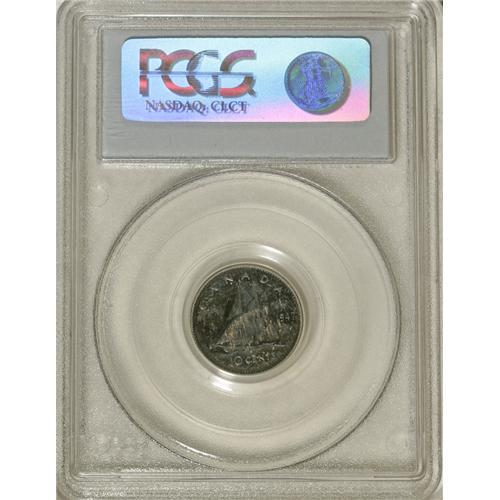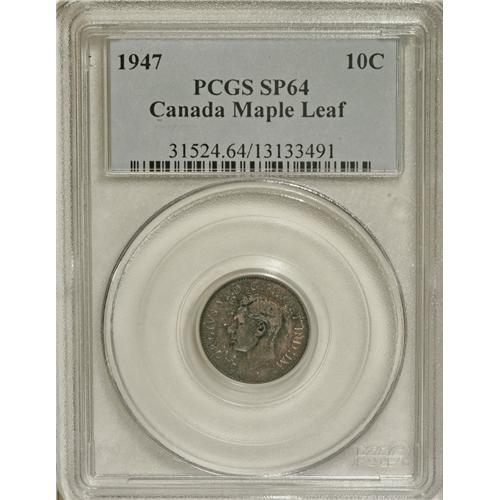 <B>George VI Specimen 10 Cents 1947 Maple Leaf, </B></I>KM34, Specimen 64 PCGS, heavily toned with russet and blue-green flashes.<BR><BR><b>Shipping:</b> Coins & Currency (<a target="_blank" href="http://www.heritageauctions.com/common/shipping.php">view shipping information</a>)