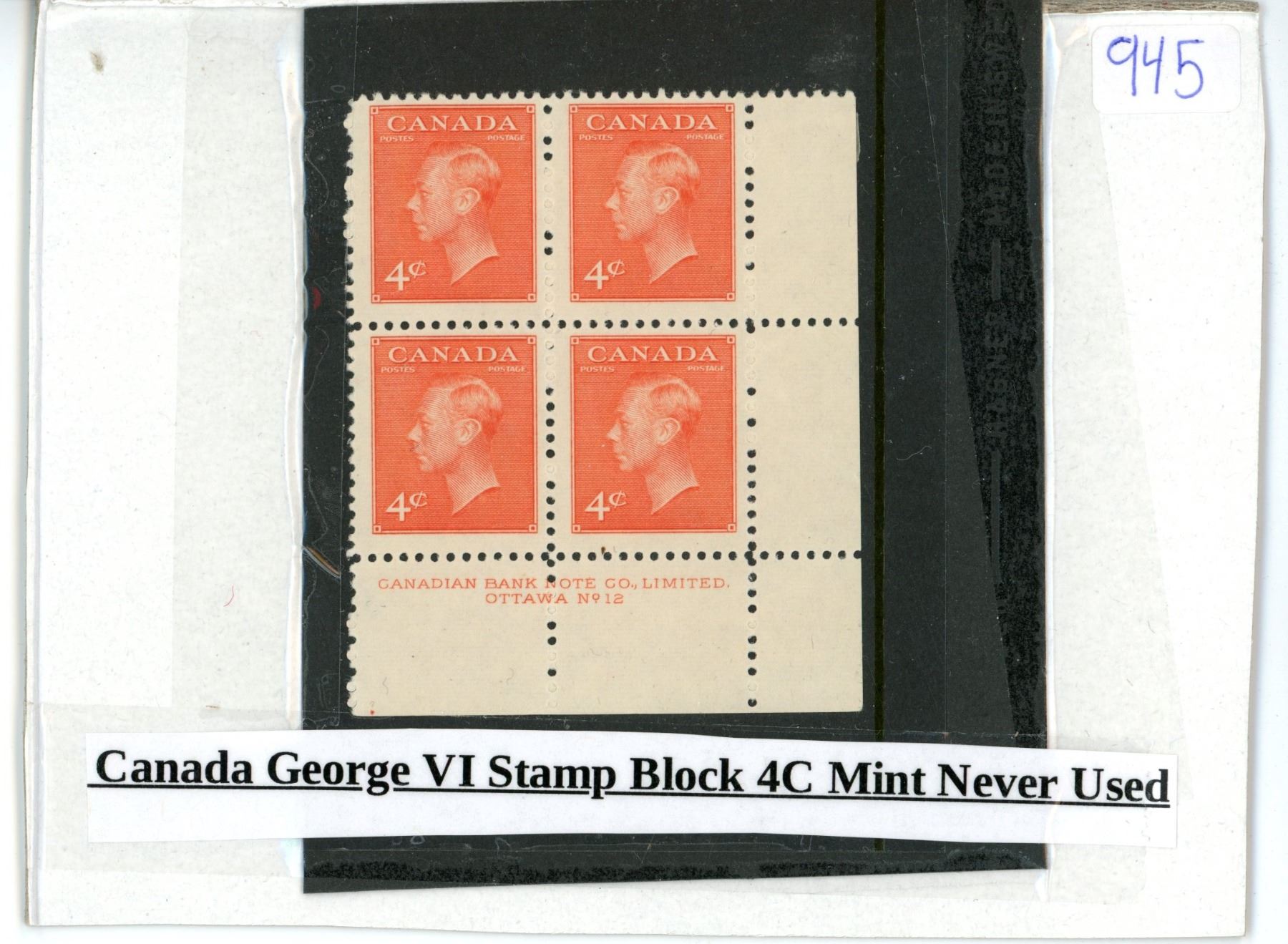 Canada George VI Stamp Block 4C - Mint, never used
