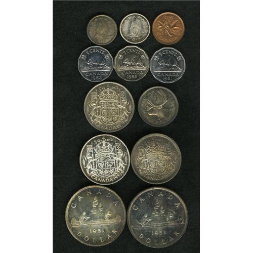 <B>High Grade Modern Assortment, </B></I>a nice group of early 1950's coins featuring: 5 Cents, 50 Cents and Dollar 1951, the Dollar a specimen strike, 5, 10 and 50 Cents 1953 NSF and Dollar 1953 SF, and 1955, 1, 5, 10, 25 and 50 Cents. Grades range from AU-BU. <B>Sold as is, no return lot.</B></I><BR><BR><b>Shipping:</b> Coins & Currency (<a target="_blank" href="http://www.heritageauctions.com/common/shipping.php">view shipping information</a>)