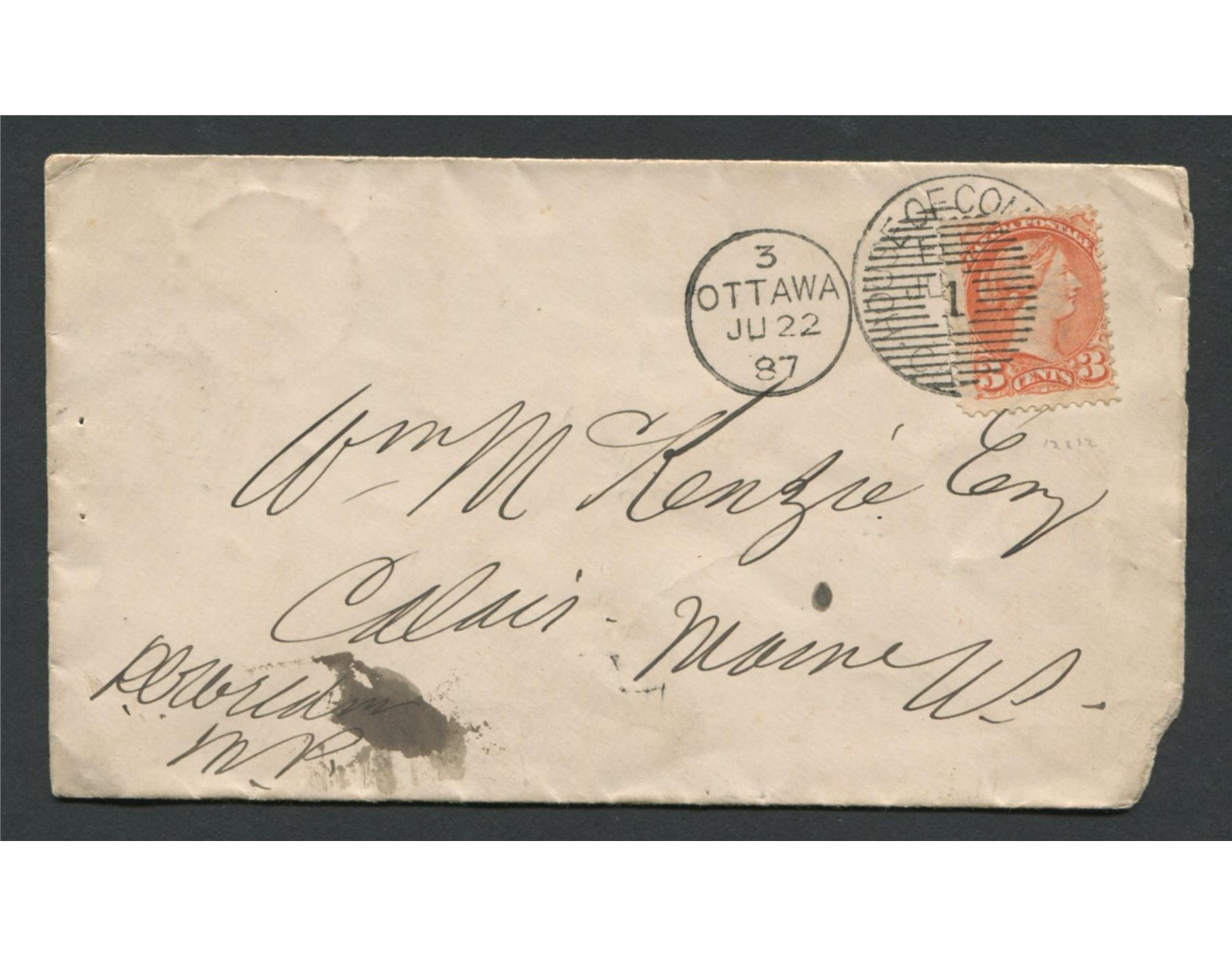 Canada House of Commons stamp cover. Stamp is a 3 cent Victoria small queen, with a fairly clear House of Commons circular cancel, and a clear and distinct Ottawa circular cancel, cancelled 1887.